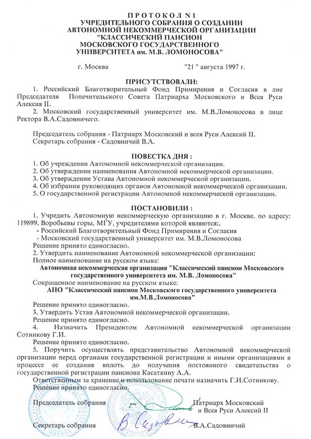 Протокол № 1 об учреждении АНО Классический пансион МГУ им. М.В.Ломоносова, об избрании руководящих органов организации